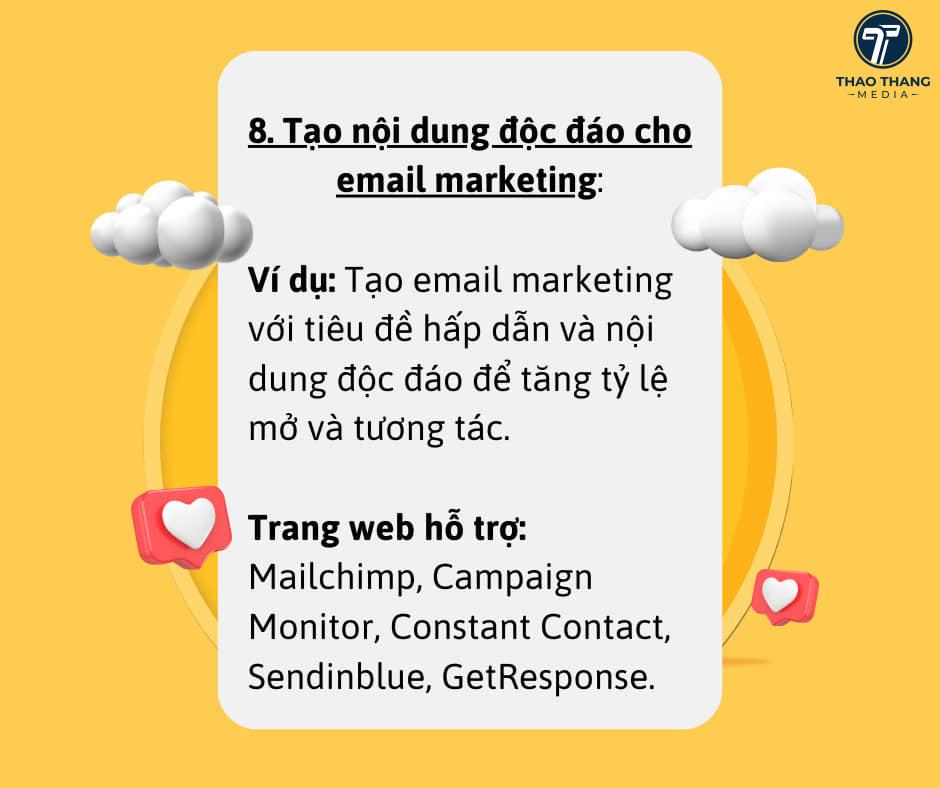 Ví dụ: Tạo email marketing với tiêu đề hấp dẫn và nội dung độc đáo để tăng tỷ lệ mở và tương tác.